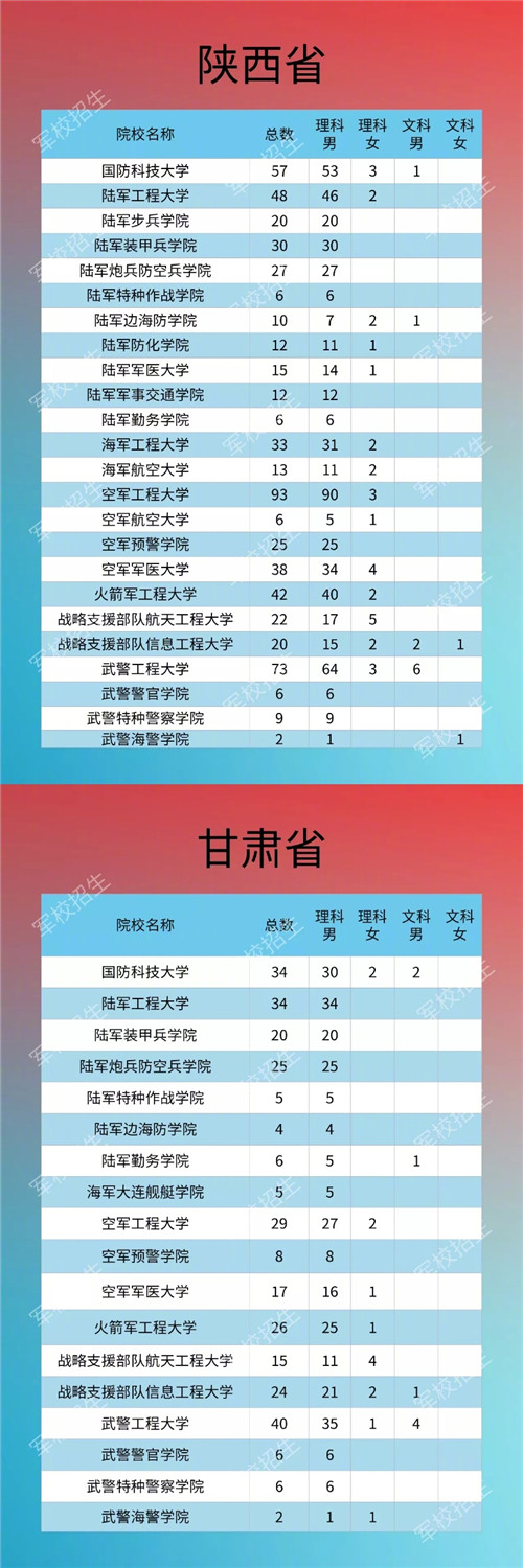 2020年全国军队院校各省市招生计划及人数汇总相关文章: